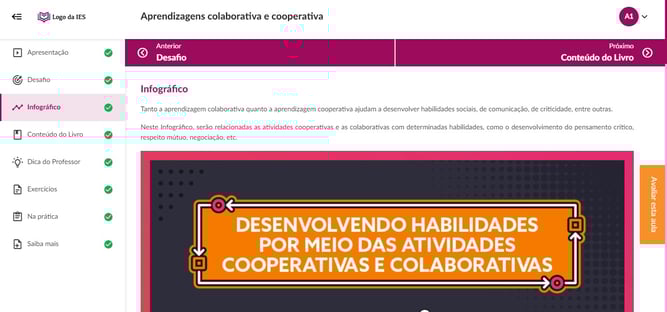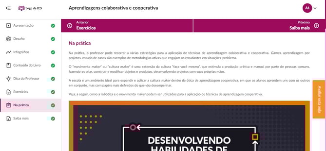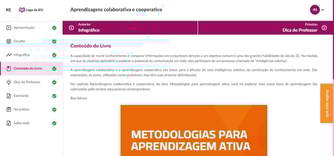 Primeiramente, é por meio do texto introdutório que o aluno entende quais os temas serão abordados na unidade. Também fica a par dos Objetivos de Aprendizagem, os quais delimitam as competências a serem atingidas ao final da UA. Estes são criados com verbos de ação, a partir da Taxonomia de Bloom.