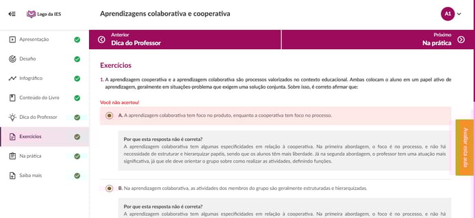 Os exercícios são questões de autoestudo, em formato de múltipla escolha, que avaliam se o aluno conseguiu atingir as competências propostas nos objetivos de aprendizagem. É o momento em que a teoria vista na Unidade de Aprendizagem é colocada em situação de uso ou prática.